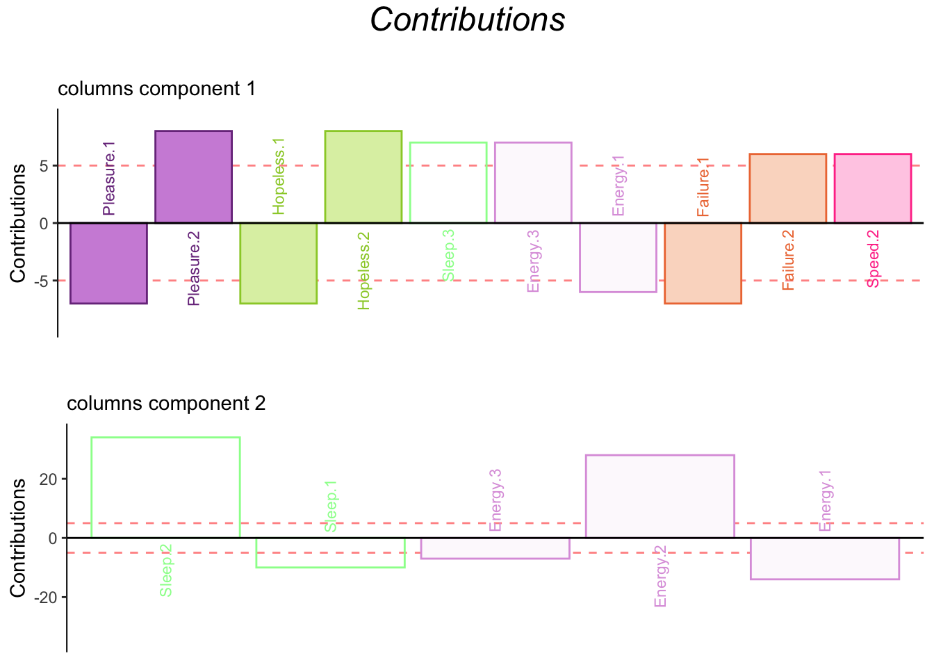Columns: Some participants score “no days” on pleasure, hopeless, energy, and failure while some participants score “several days or higher” on pleasure, hopeless, sleep, energy, failure, and speed.