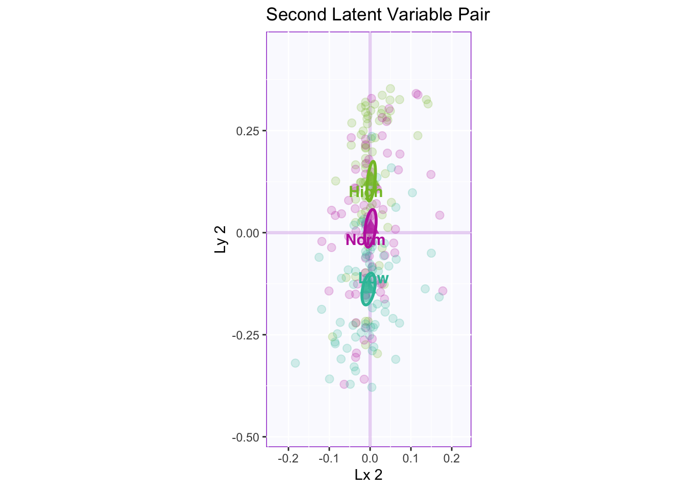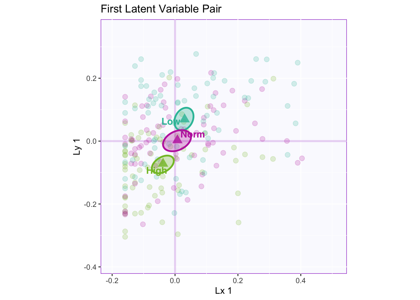 Lxy 1: The first latent variable pair shows that there is a reliable separation between high memory and normal/low. Both latent variables are contributing to this separation via the angle between the means approaching 45 degrees.