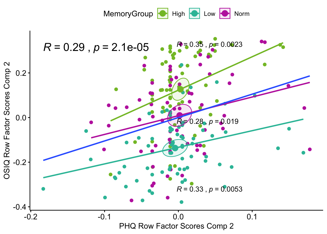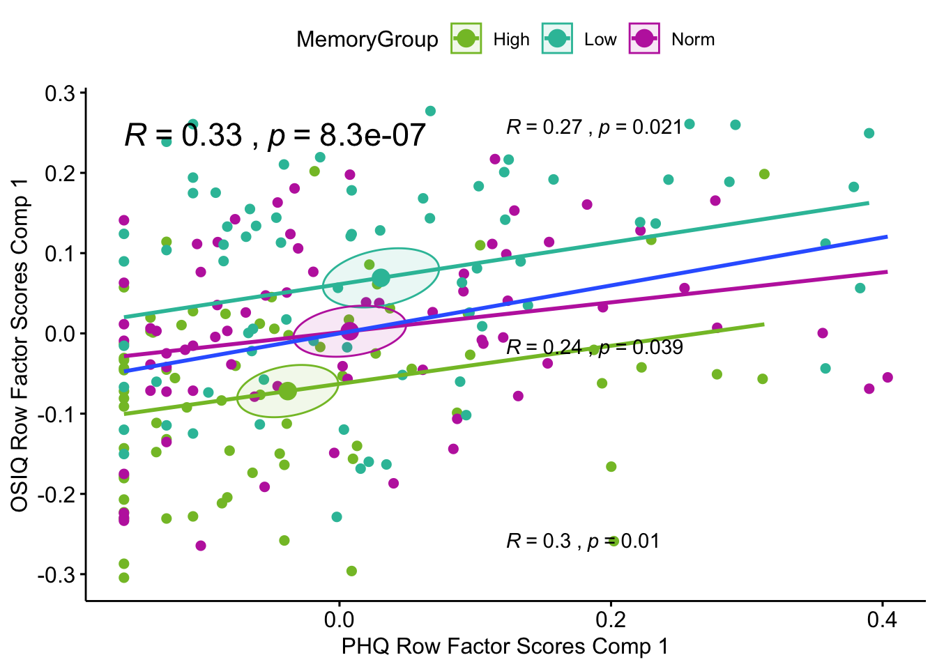 Lxy 1 Correlation Plot: Here the confidence intervals are computed by FactoMineR and they show similar separation. The overall correlation between the tables when analyzing the design varaible i.e. memory groups, is a significant correlation of .33 (blue regression line). There are also significant correlations within each group: .27 for low memory, .24 for normal memory, and .30 for high meomry.