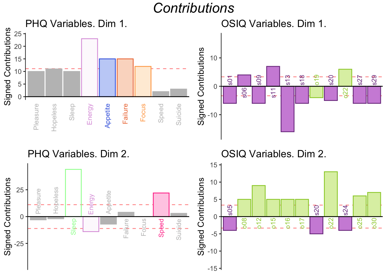 Dimension 1: PHQ weights are positively contributing to the Lx 1 and most of the OSIQ variables are are negatively contributing to Ly 1, which is similar to what was shown in the correlation plot.