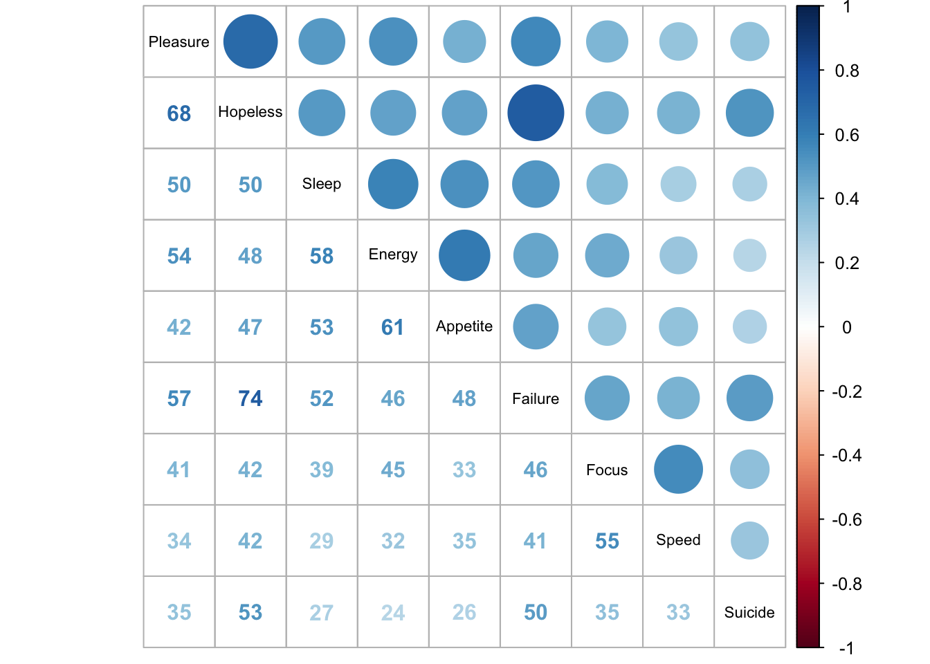 We can see that all questions are positively correlated with each other. Feelings of failure and hopleness have the highest correlation of .74. Loss of pleasure and hopeless are also highly correlated (.68).