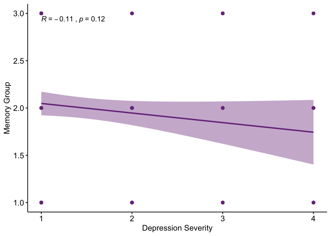 From the correlation plot we can see that in this data set depression severity is not significantly correlated with what memory group the participants are in.