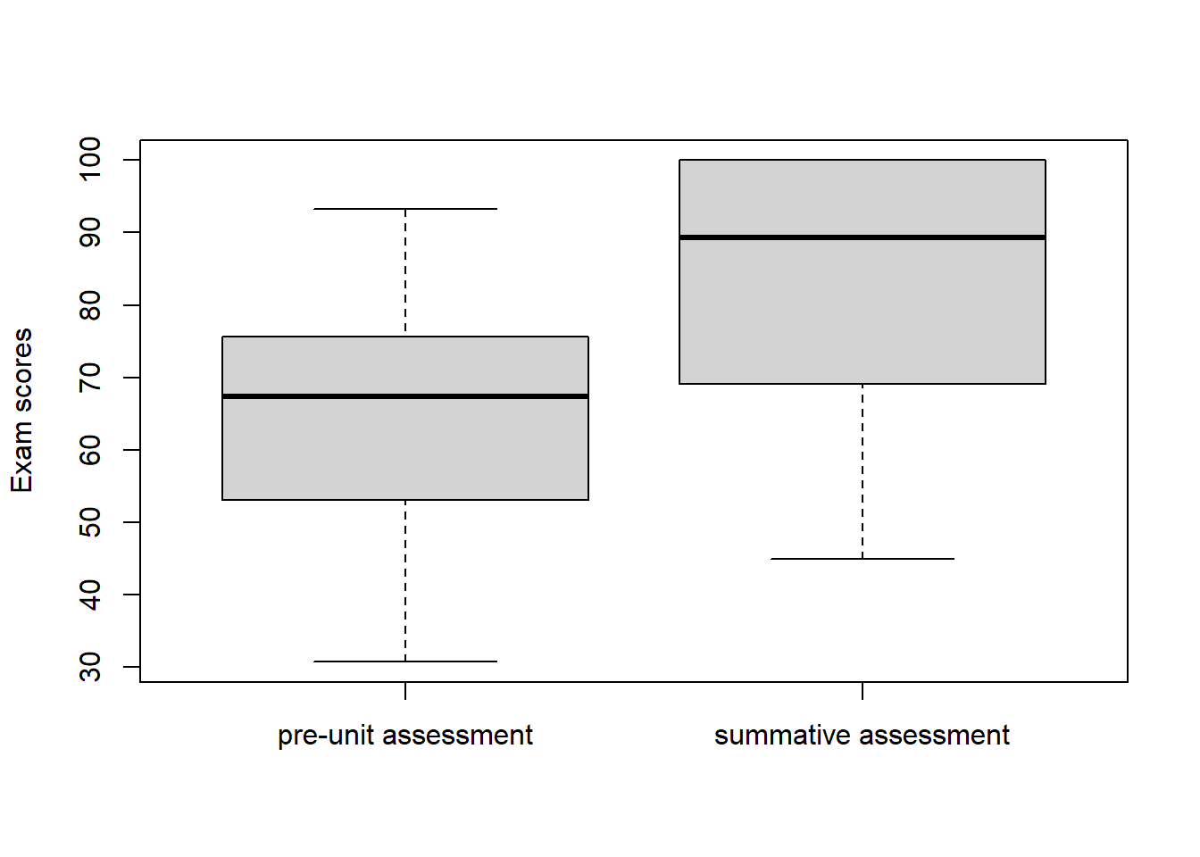 boxplot(pre_scores, post_scores, names = c("pre-unit assessment", "summative assessment"), ylab = "Exam scores")