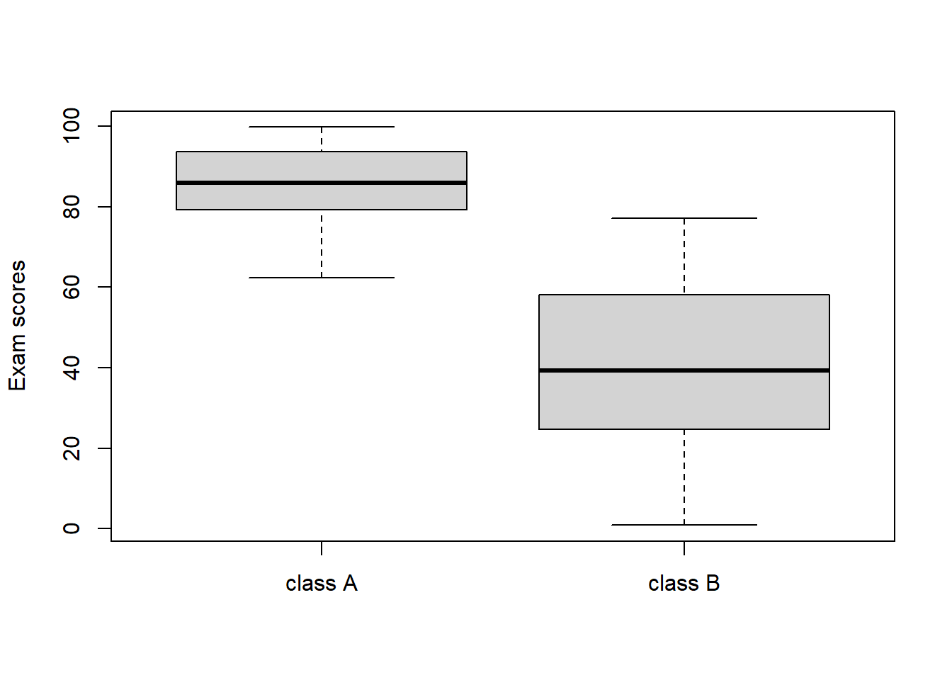 boxplot(classA, classB, names = c("class A", "class B"), ylab = "Exam scores")