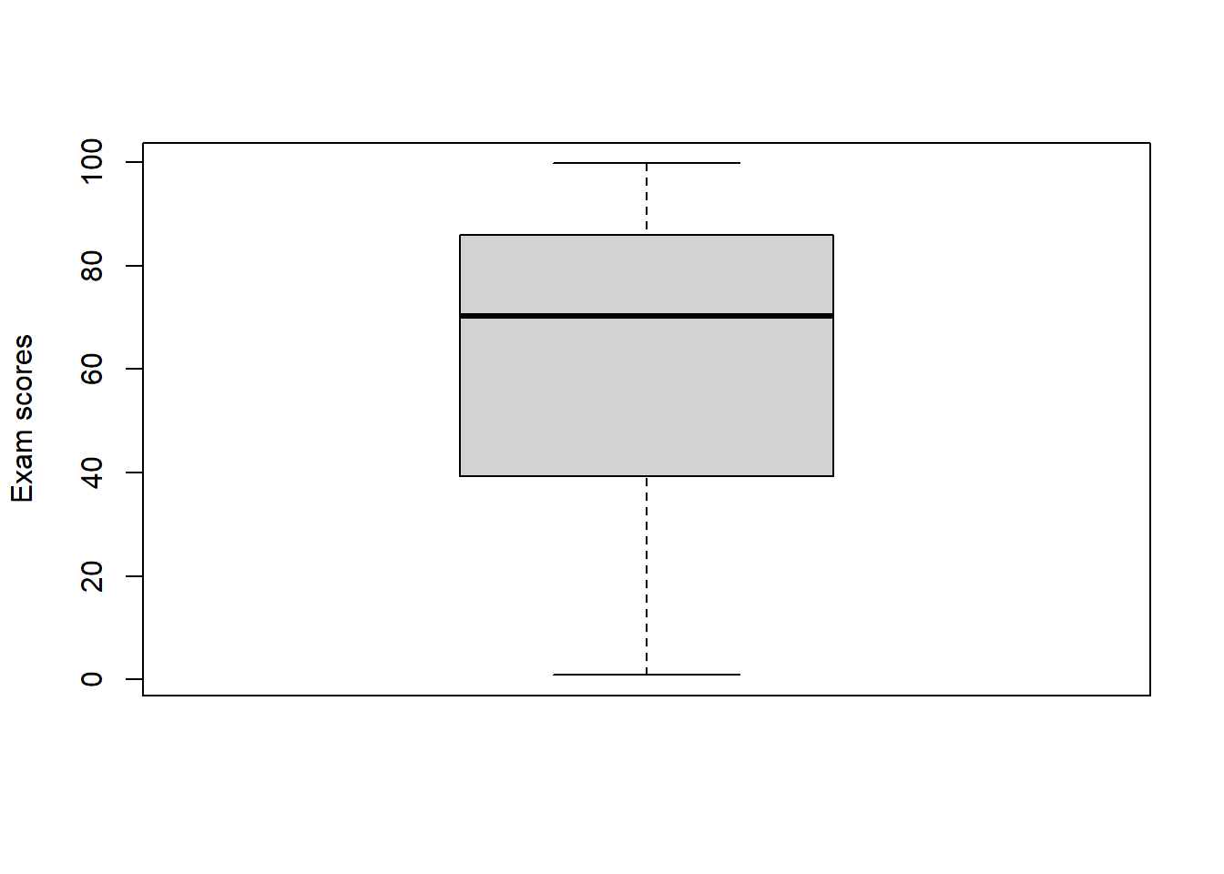 boxplot(c(classA, classB), names = c("combined classes"), ylab = "Exam scores")