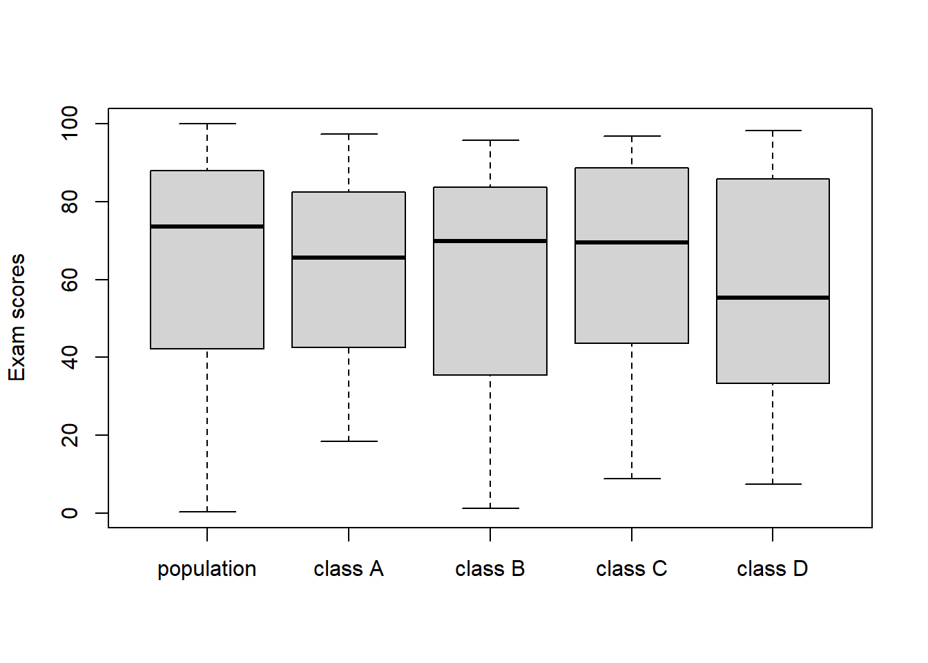 boxplot(population, class1, class2, class3, class4, names = c("population", "class A", "class B", "class C", "class D"), ylab = "Exam scores")