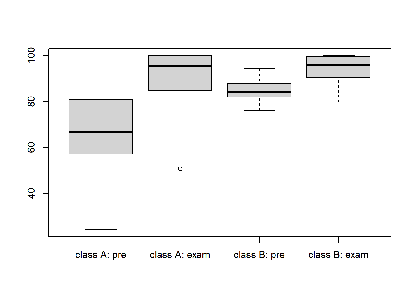 names = c("class A: pre", "class A: exam", "class B: pre", "class B: exam"))