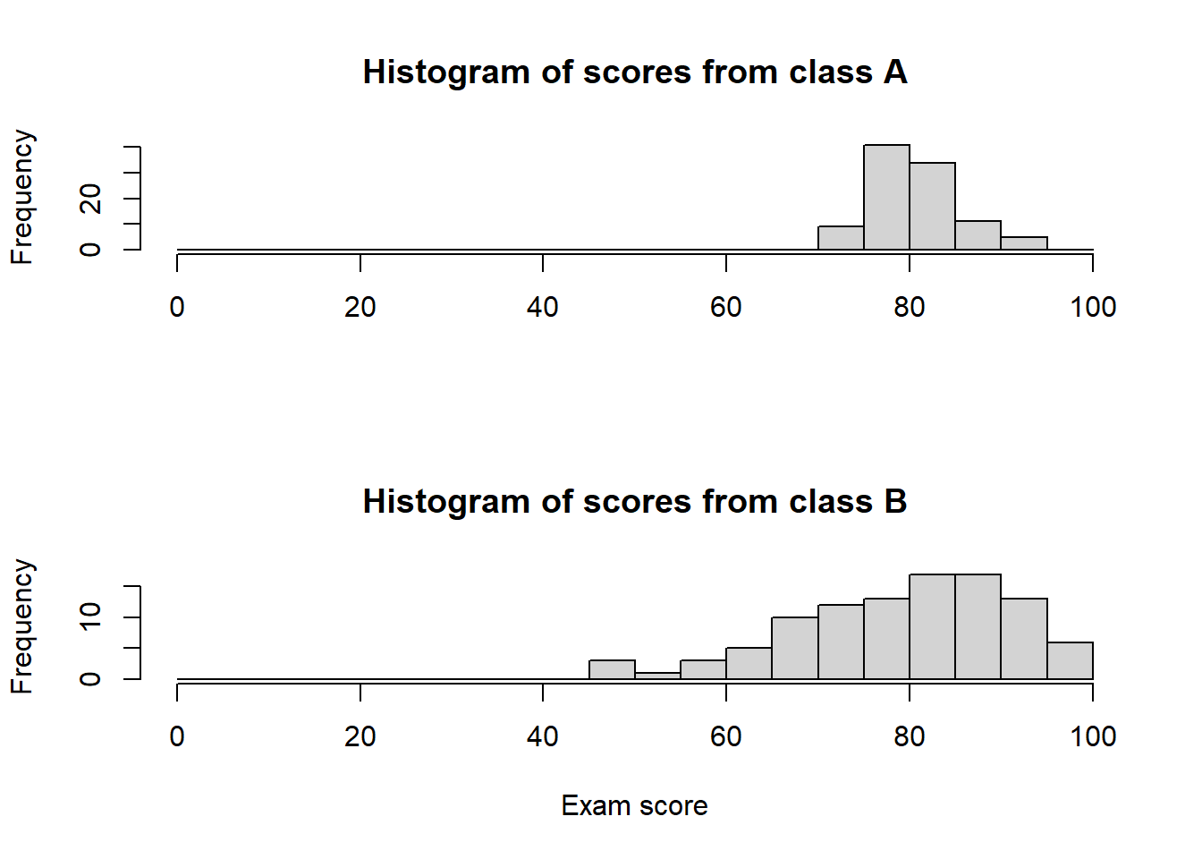 The above figure shows you two histograms of the scores from the two classes. Histograms are amazing: they show you the number of students (y-axis, or “Frequency”) with scores that fall into “buckets” or “bins” (x-axis, or “Exam score”). Here, the bins are 5-units wide, e.g., 71 to 75, 76 to 80, etc.