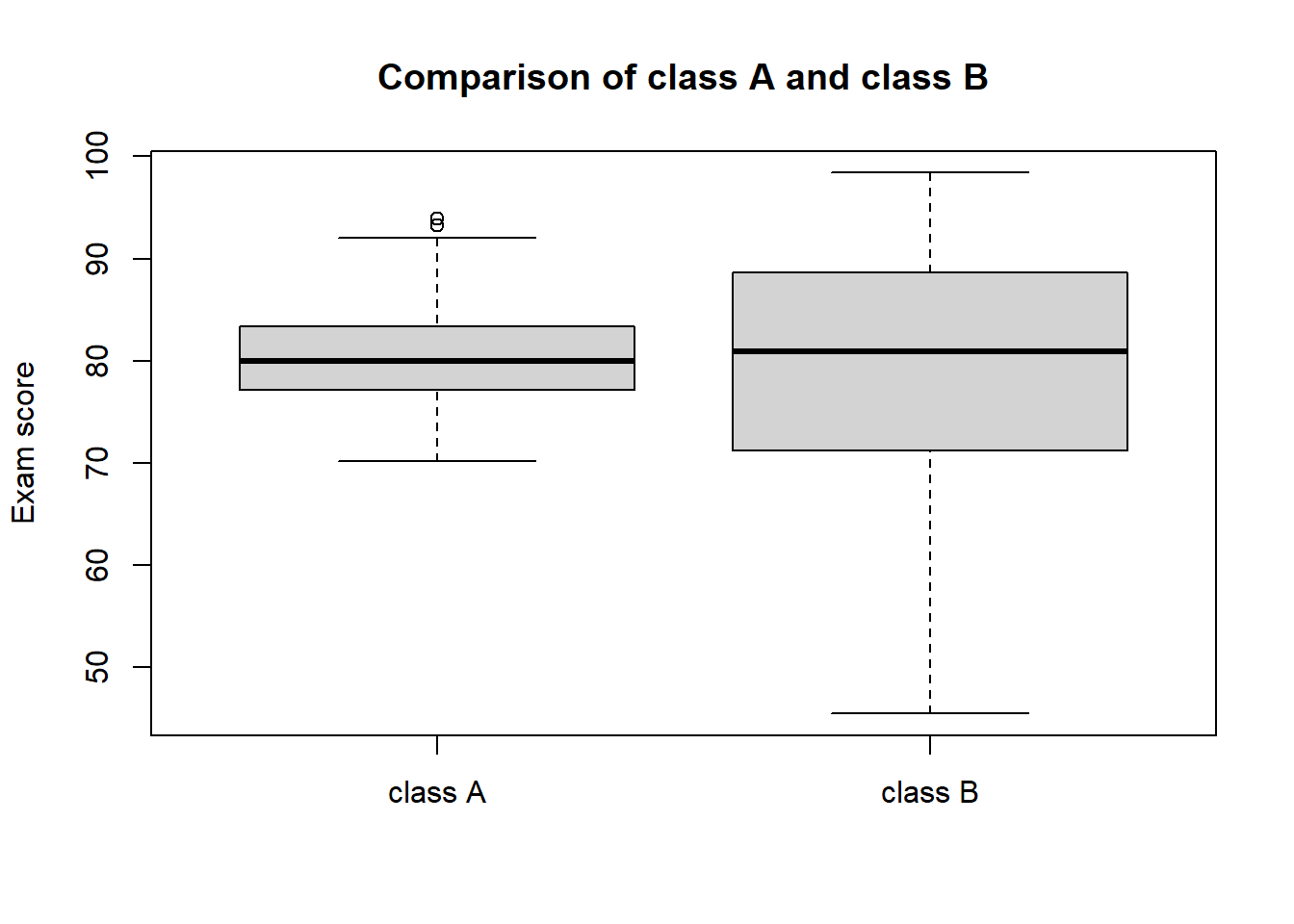 boxplot(score ~ grp, main = "Comparison of class A and class B", data = df, xlab = "", ylab = "Exam score")