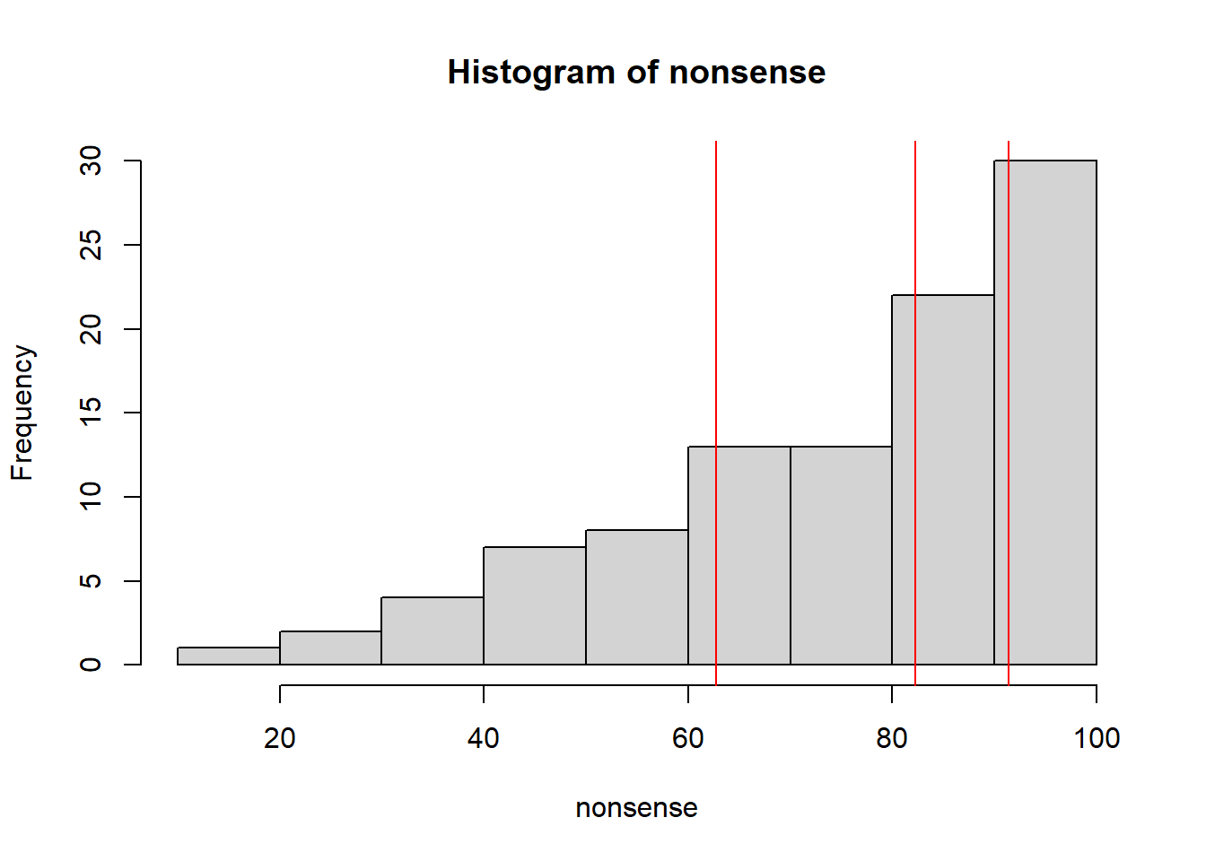 abline(v = quantile(nonsense, probs = c(0.25, 0.5, 0.75)), col = "red")