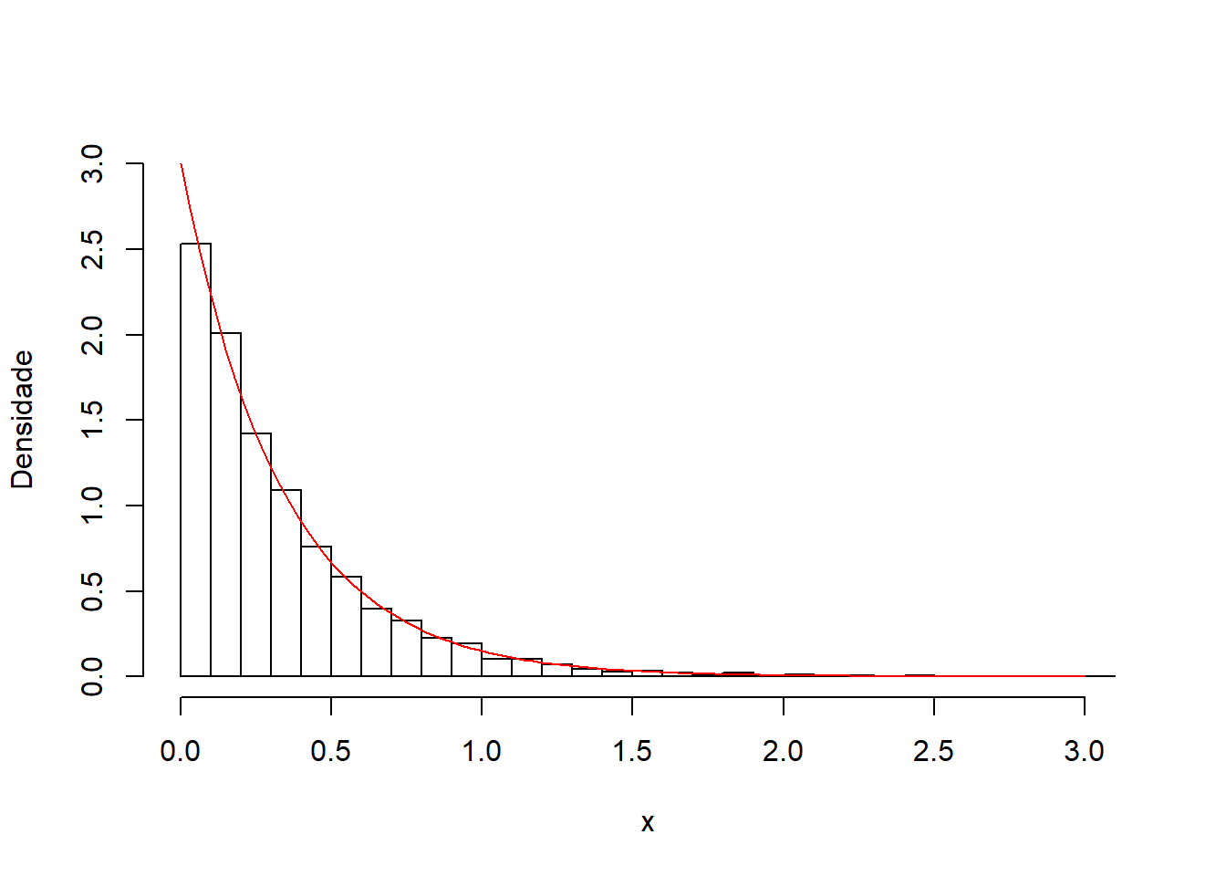 hist(x, prob=T, breaks=30, ylim=c(0,3), main="", ylab="Densidade")