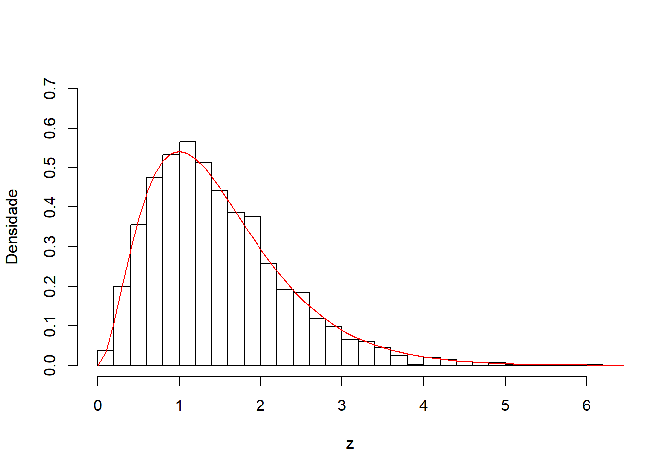 hist(z, prob=T, breaks= 30, main="", ylab="Densidade", ylim=c(0,0.7))