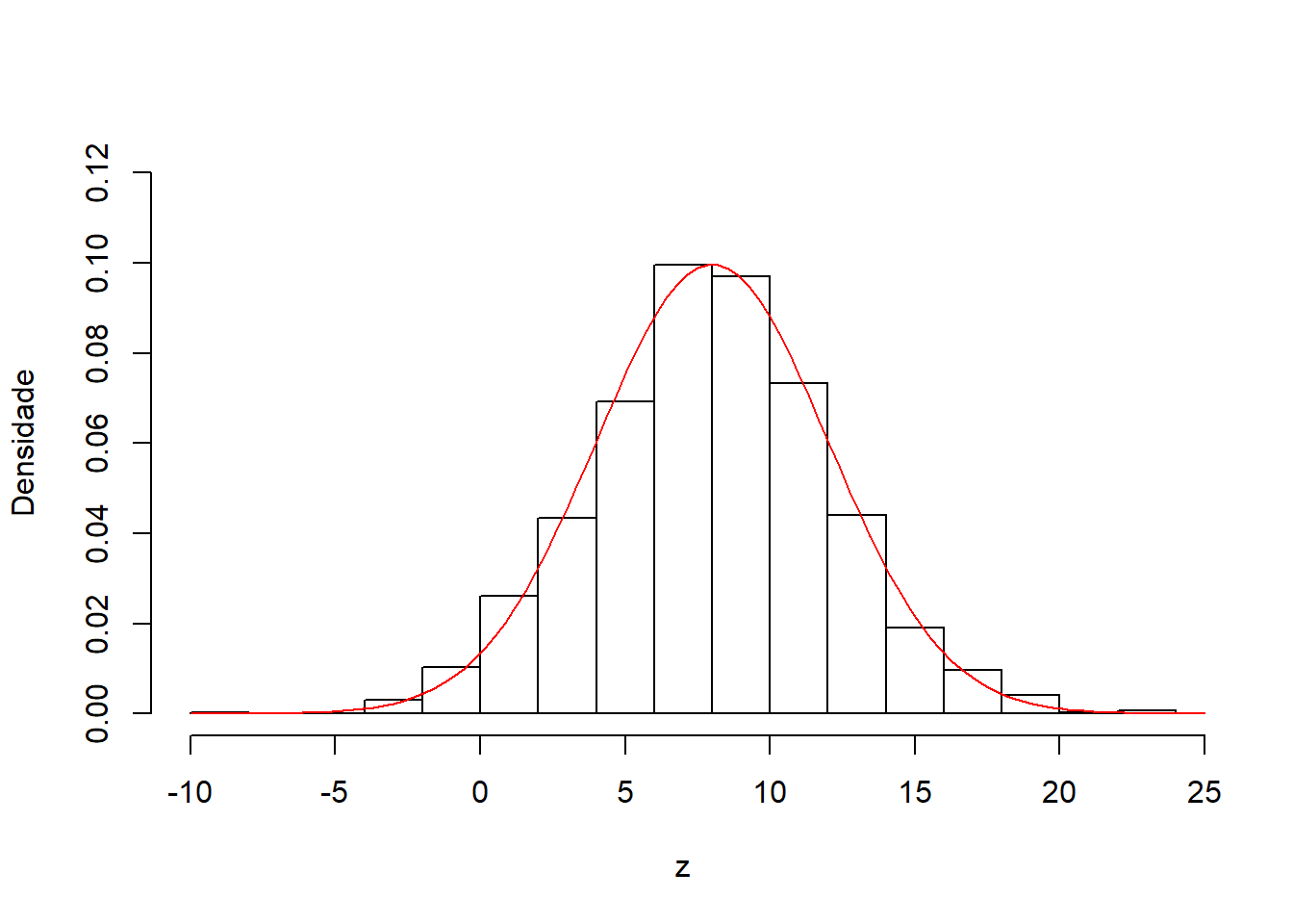 Resultado: Se \(X_{i} \sim N(\mu,\sigma^2)\), independentes, então \(\sum_{i=1}^{n}{X_{i}} \sim N(n\mu,n\sigma^2)\).