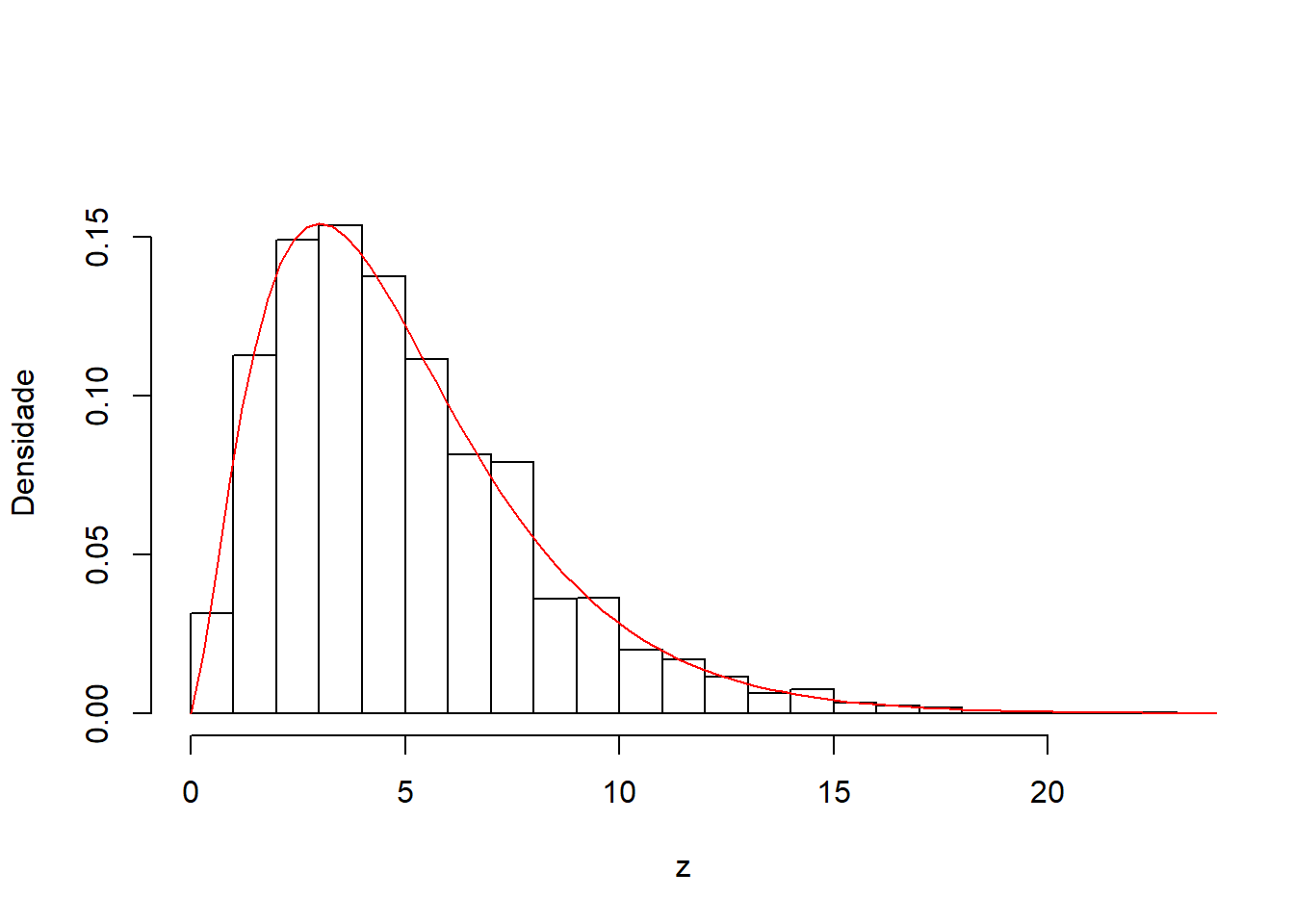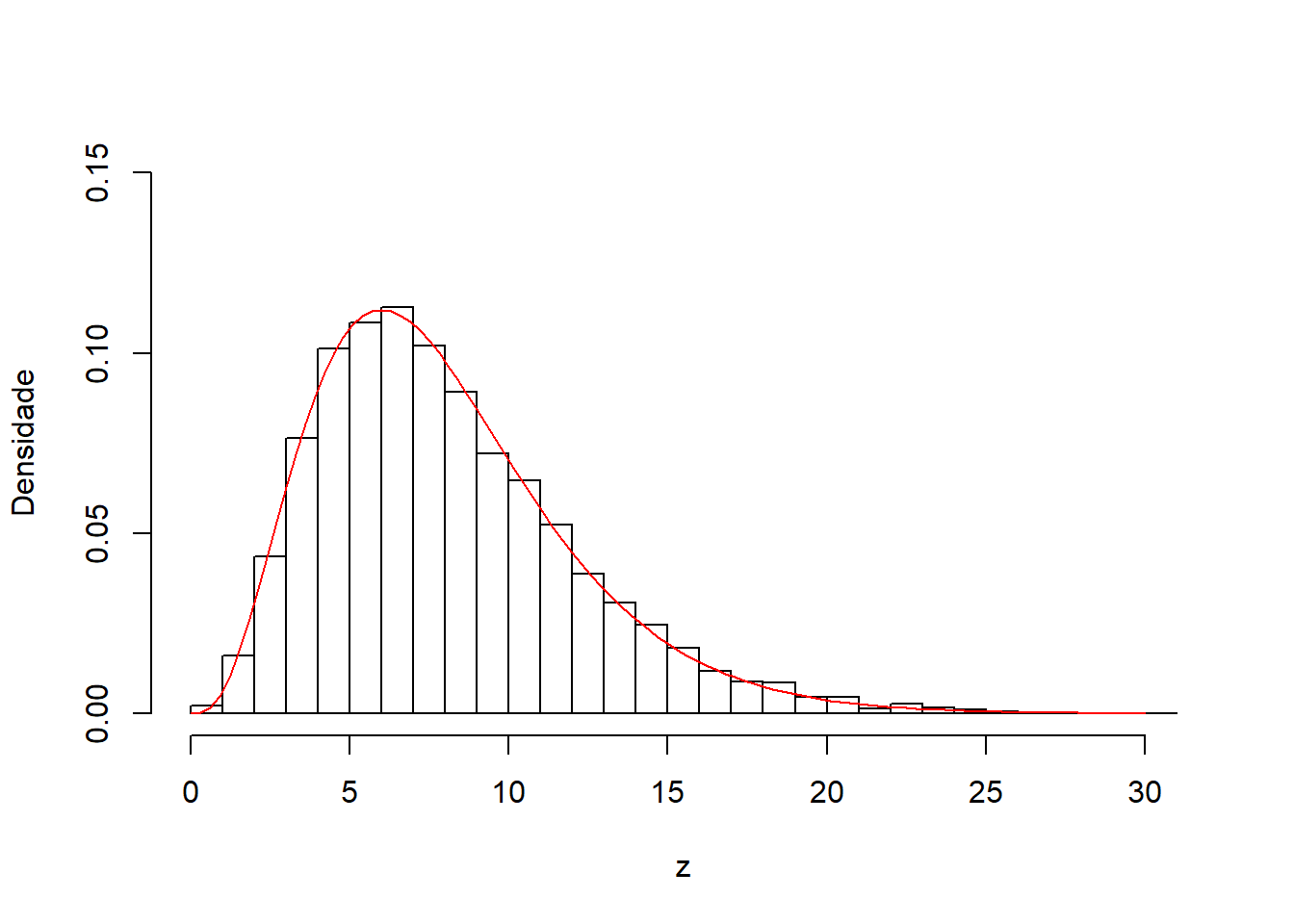 Resultado: Se \(X_{i} \sim \chi^{2}_{k_{i}}\), independentes, então \(\sum_{i=1}^{n}{X_{i}} \sim \chi^{2}_{k_{1}+\ldots+k_{n}}\).