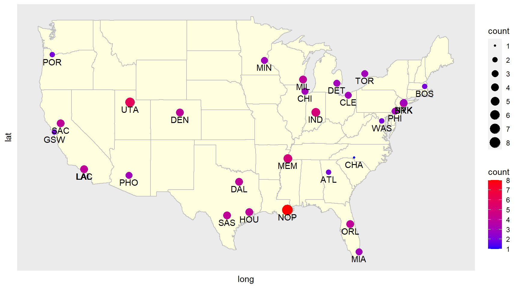 The last thing we’d like to do for this project is to study some visualization techniques using this data. What we are interested in observing is the number of triple-double Russell Westbrook recorded versus every NBA teams, during the course of his last 3 years as OKC’s starting point guard. Rather than just looking at basic numerical and summaries of this value, why don’t we plot the number of times Westbrook recorded a triple-double against each opponent to their corresponding locations on the map?