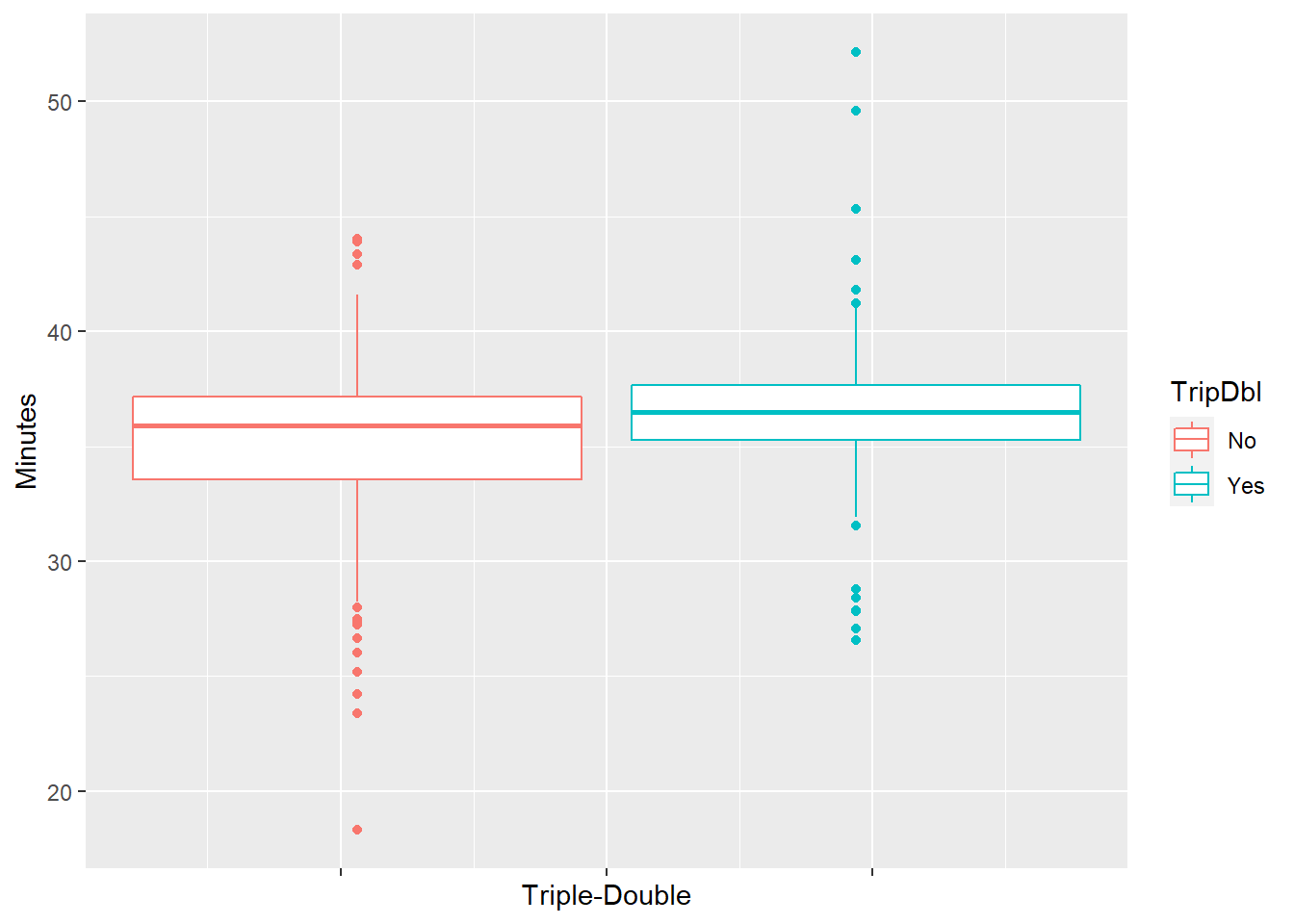It’s now time to determine whether Westbrook’s game playing time contributes to the prediction of whether he has a triple-double. Below are a boxplot and some basic descriptive statistics of Russ’ minutes played, broken down by triple-double outcomes.