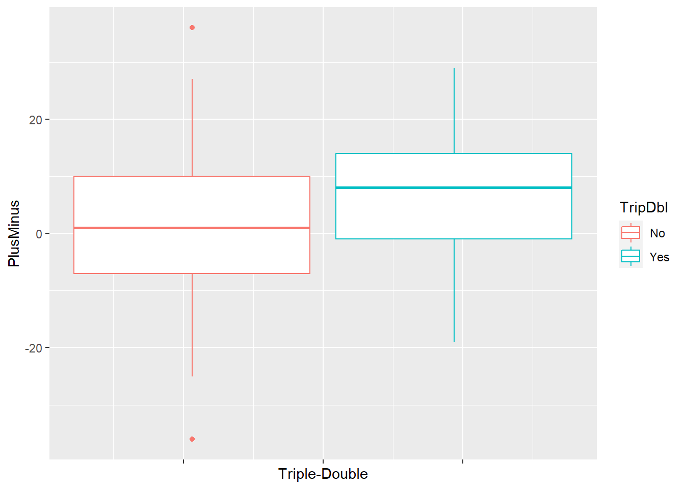 Our next goal is to examine the relationships between triple-double and some quantitative variables. Here we’re going to take a look at Westbrook’s playing time (in minutes), and plus/minus value.