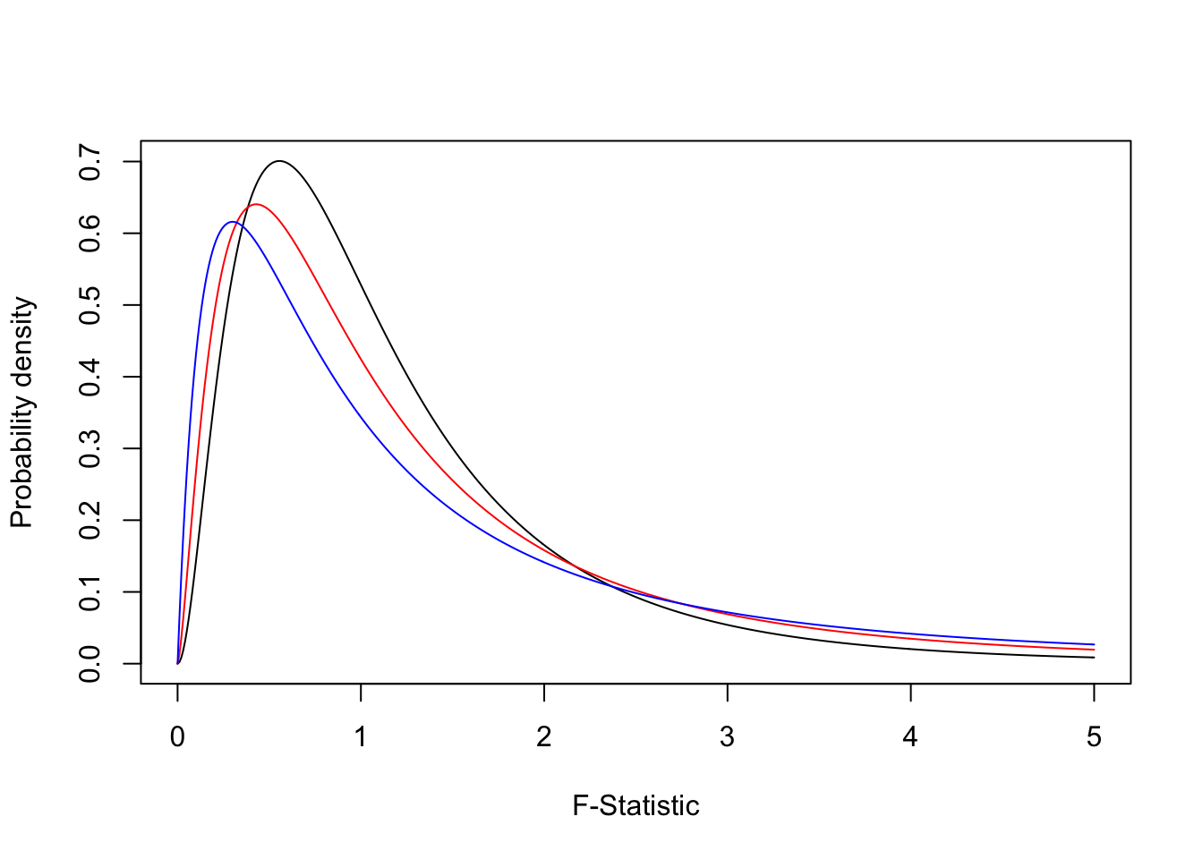 plot(seq(0,5,.01), fdata1, type="l", ylab = "Probability density", xlab="F-Statistic")