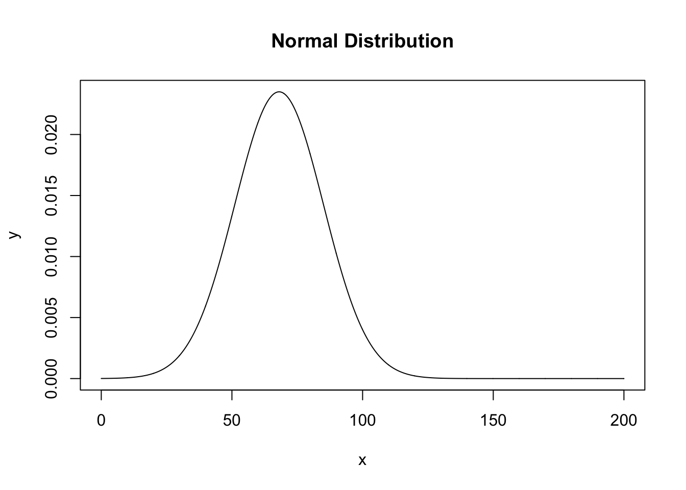 The key point here is that from this smoothly varying distribution, we can calculate probabilities. Say we sampled a tree with a dbh of 100, we can ask the question - what is the probability of finding a tree with a dbh of 100 or greater from this distribution, that is akin to finding the area under the curve for everything to the right of the 100 value on the x-axis. We will use a special probability function in R to get this, it is called pnorm