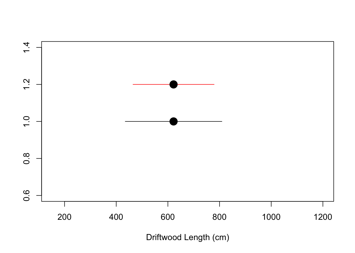 plot(x=c(lower, upper), y=c(1, 1), type="l", xlim = c(min(x),max(x)), xlab="Driftwood Length (cm)", ylab="", col = "Black")