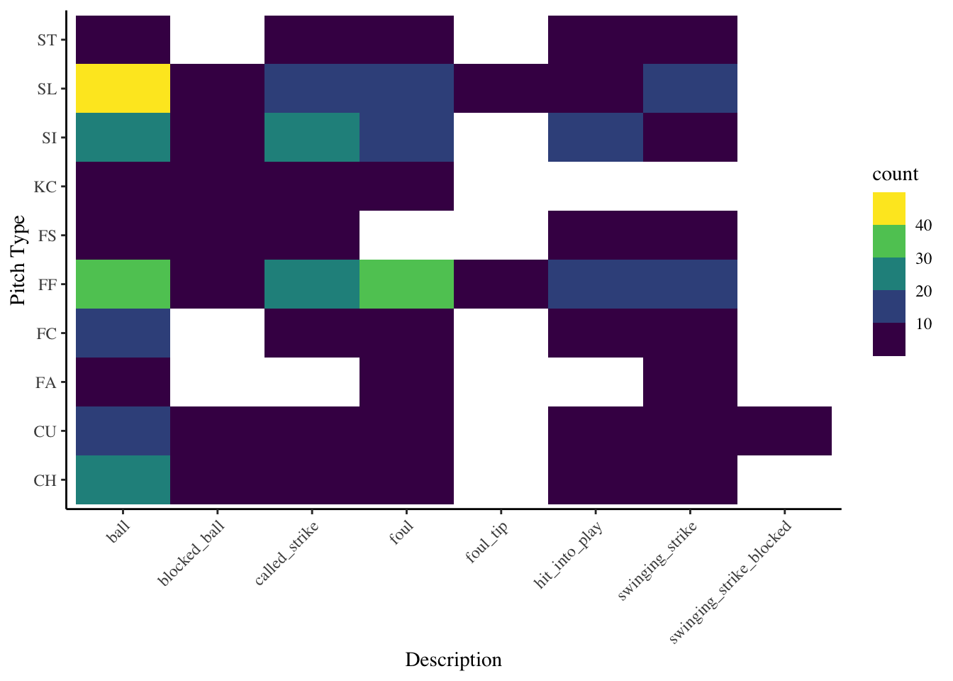 labs(x = "Description", y = "Pitch Type", color = "Release Speed") +