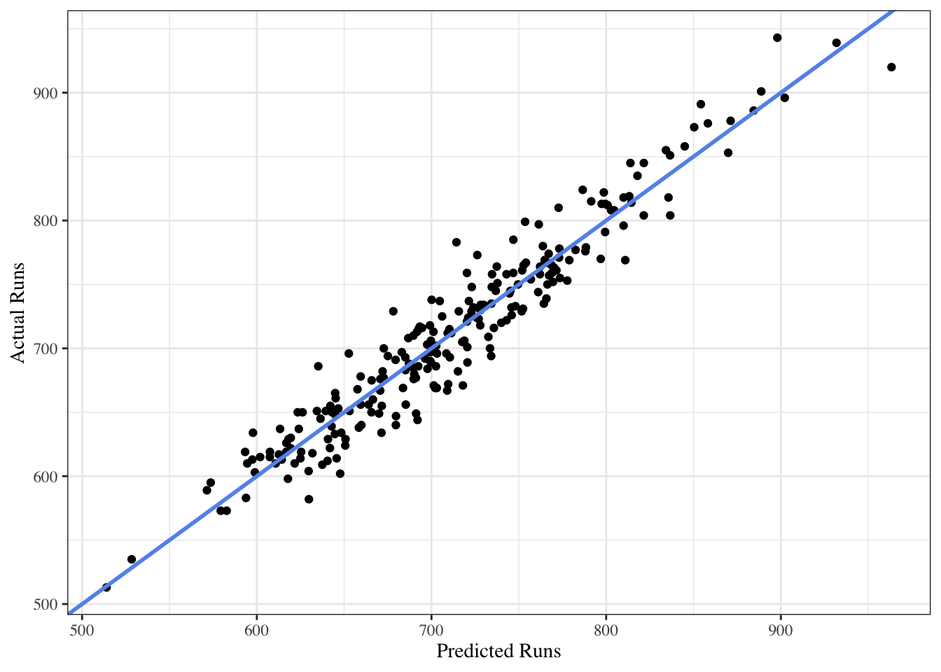 ## lm(formula = R ~ X1B + X2B + X3B + HR + BB + HBP + SO + nonSO +
