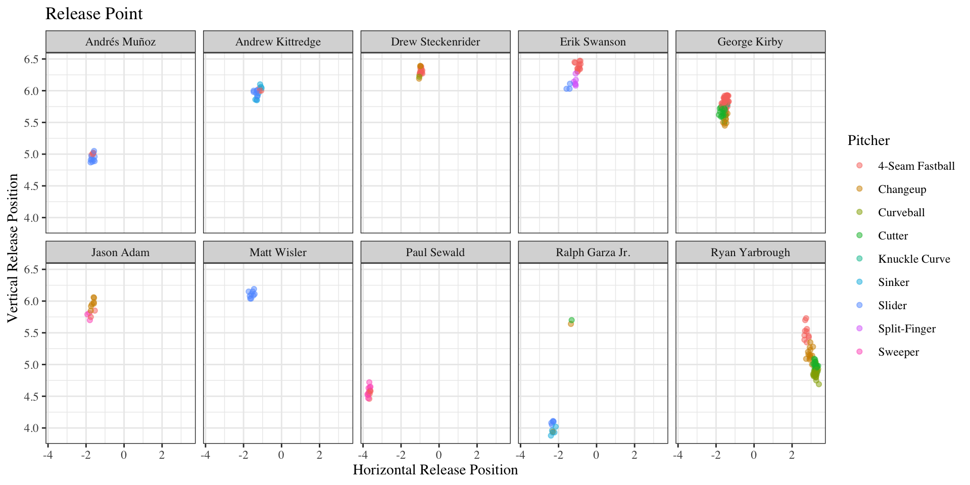 labs(title = "Release Point", color = "Pitcher",