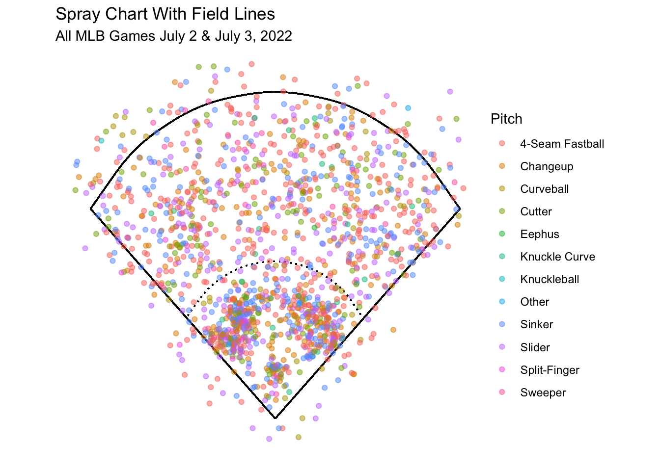 }It is important to note that geom_spray() plots the lines for an average ballpark. Each park can differ a bit in their dimensions, but overall have this shape.