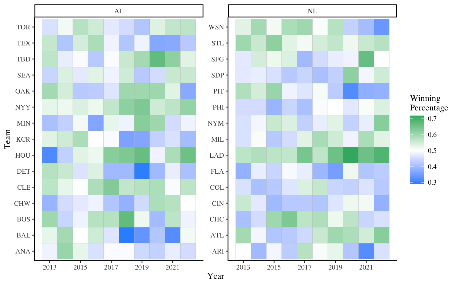 Let’s focus on Houston for a moment. In 2013 their winning percentage was very low, somewhere near 0.300. The following year the tile is a much lighter blue, closer to 0.500. The next five seasons are green, with 2019 being the most saturated green and therefore best season. Their 2020 tile is pure white, indicating an even 0.500 season.