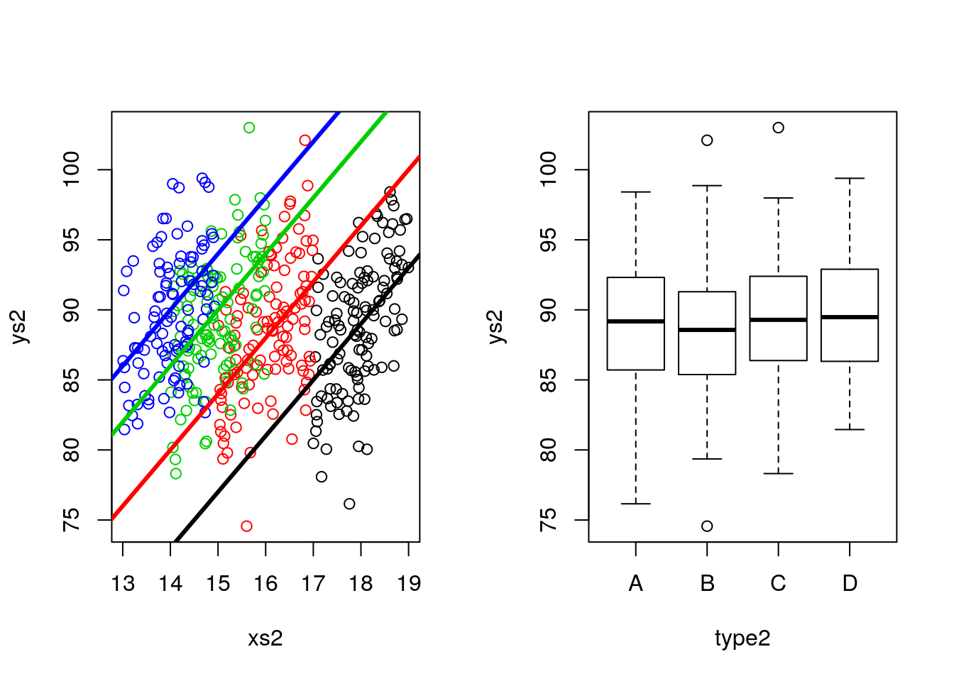 Note this corresponds to comparing weights while not accounting for differences (in lengths), and comparing weights while accounting for those differences. In other words, we are interested in different intercepts in the left plot below, not in the boxplots of the right plot, that ignore the effect of length.