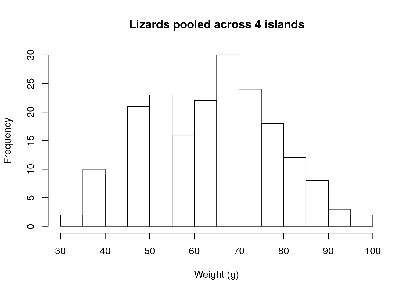The distribution is unimodal and about simetrical. When lizards are separated by island, they look like this