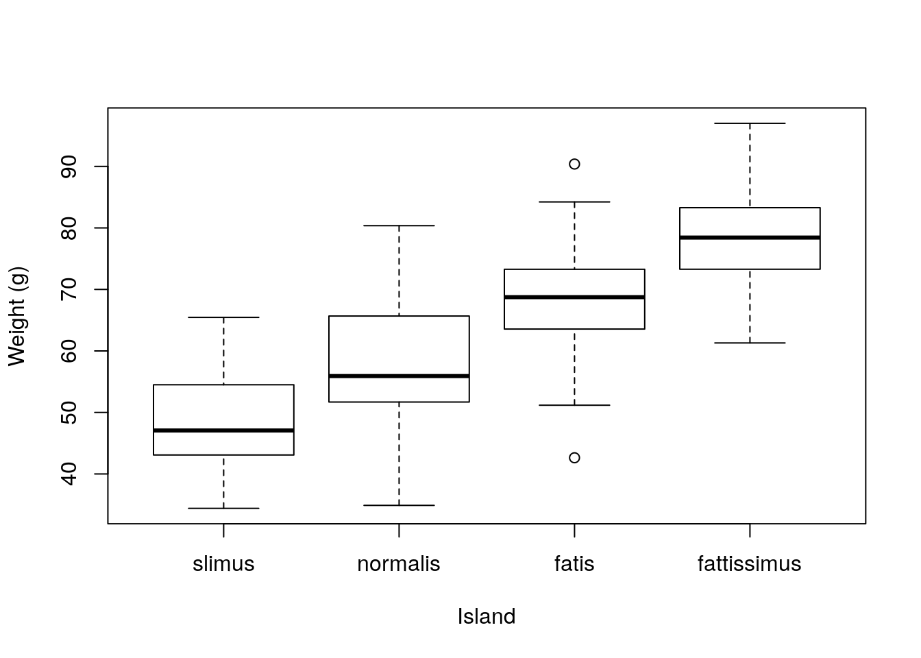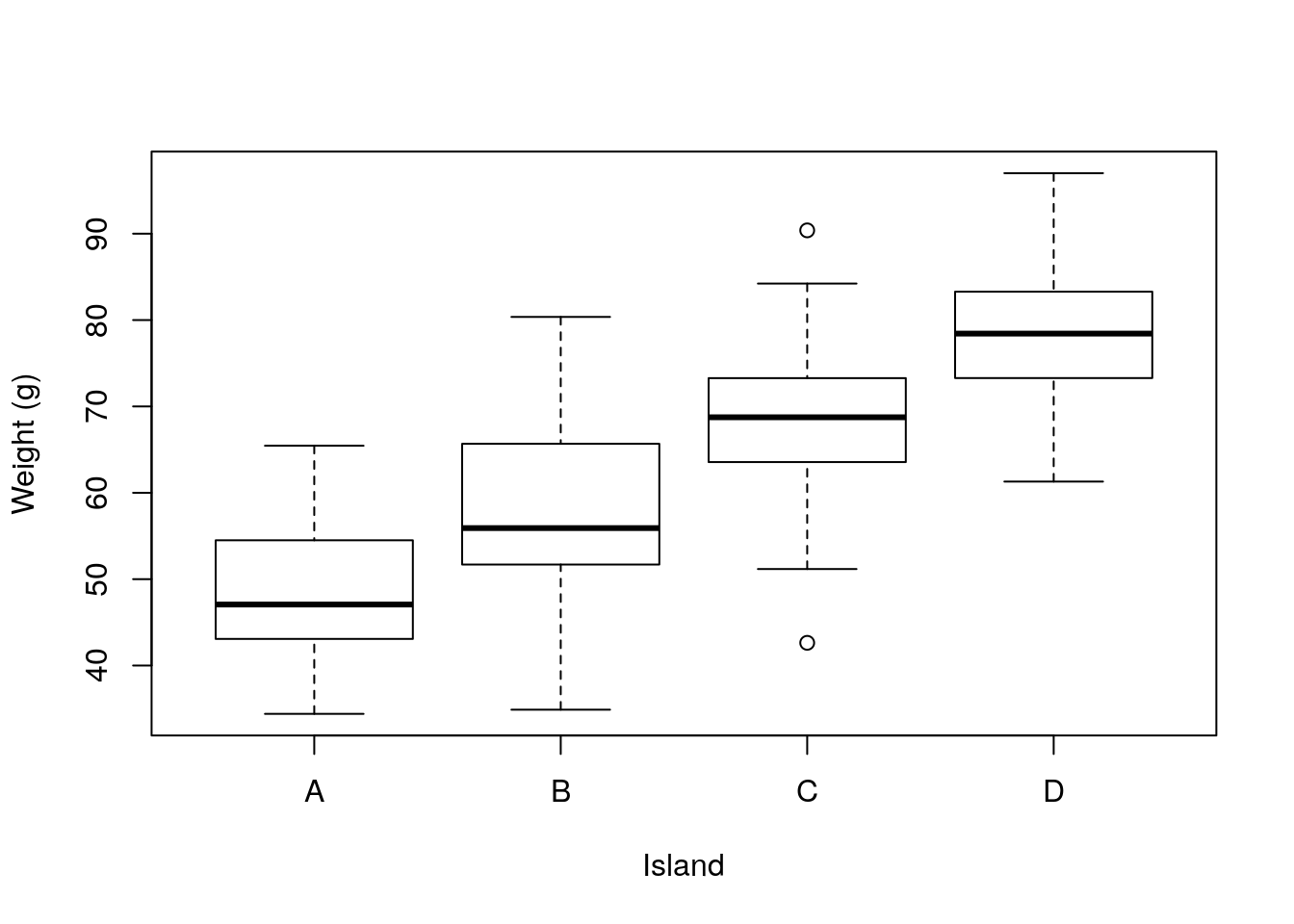 boxplot(ys~type,ylab="Weight (g)",xlab="Island",