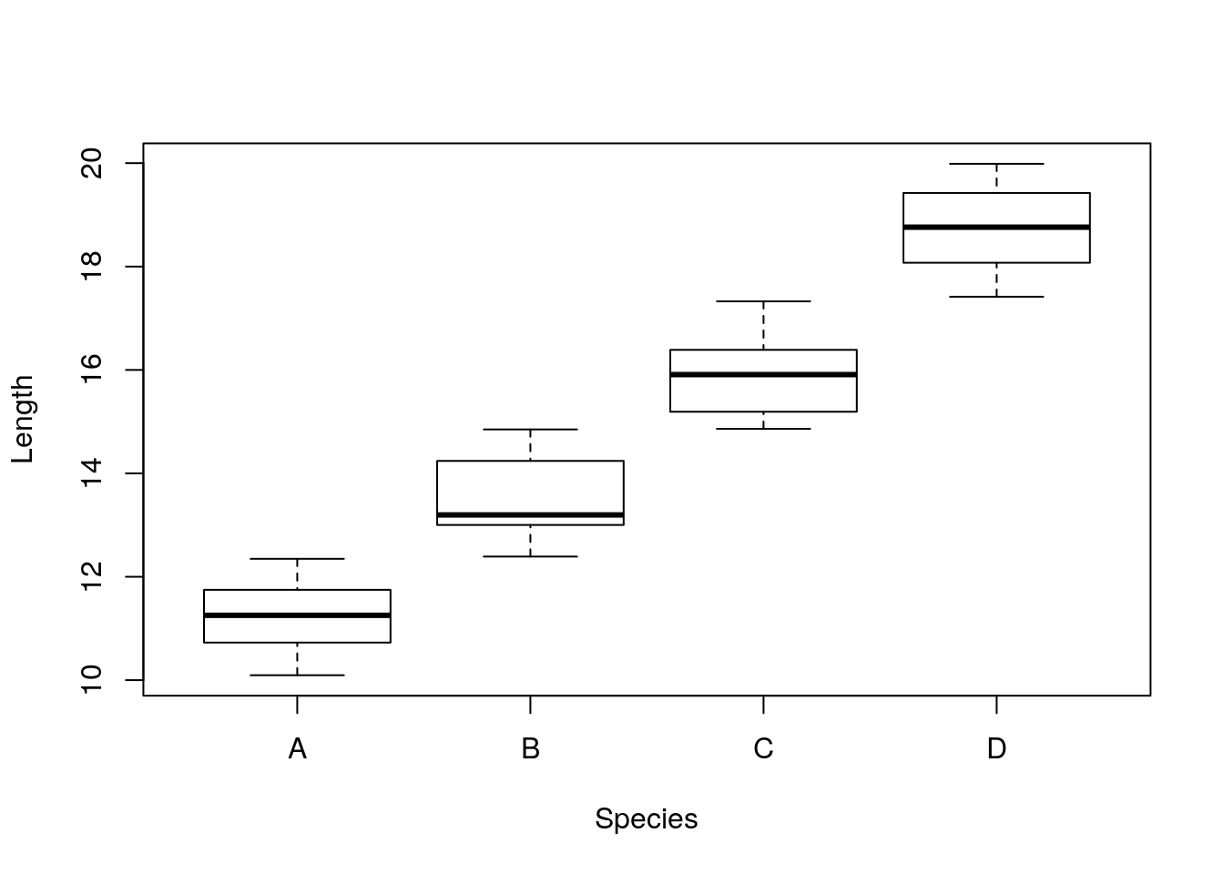 Imagine Great wanted to compare the weights of lizard specimens he collected in each of the 4 islands. He happen to capture a number of animals in each island, and we will label them as A to D, as per the islands.