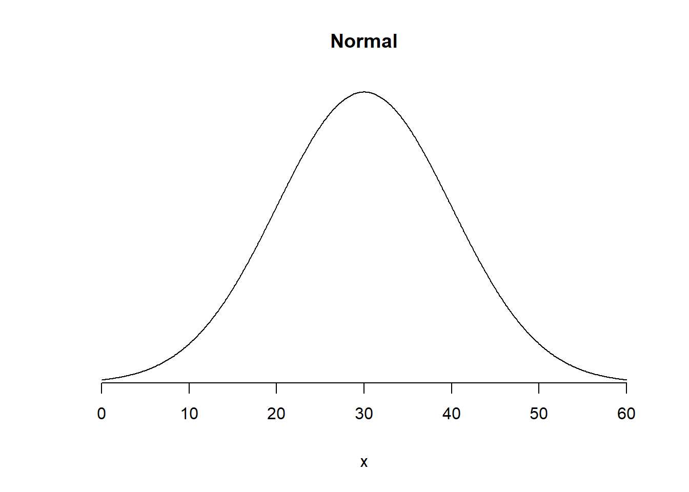 plot(x, dnorm(x, 30, 10), type = "l", axes=FALSE, ylab="",main="Normal")