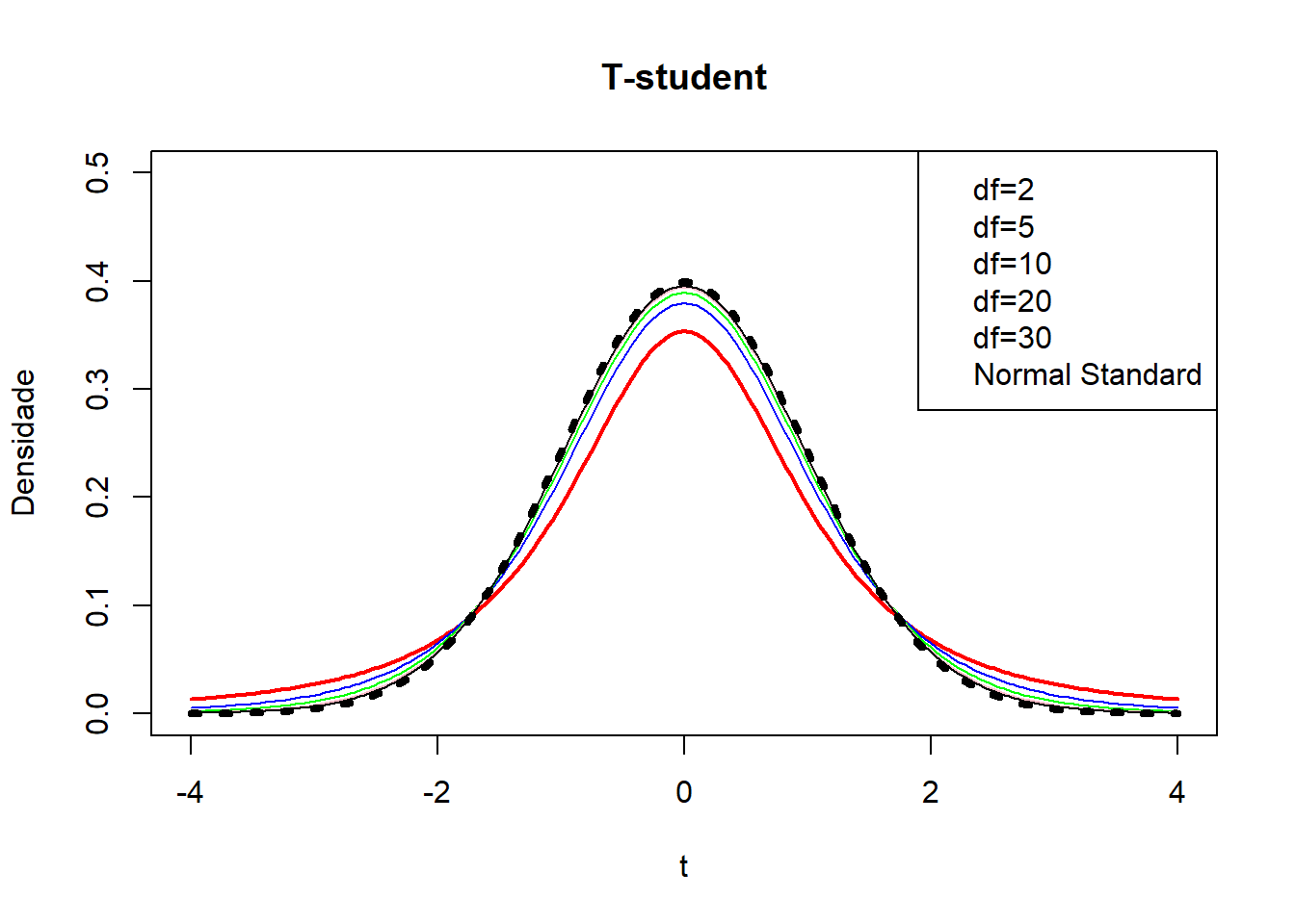 A distribuição t-Student apresenta uma distribuição simétrica em torno da média próxima de zero, com um aspecto semelhante à curva normal padrão.