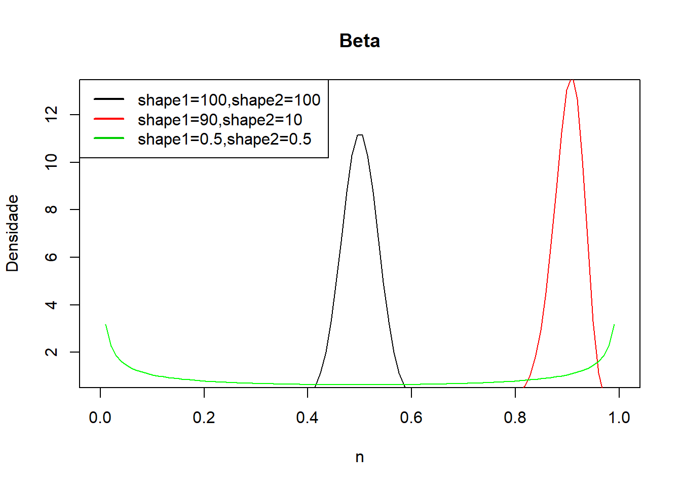 → No R não existem valores de default para os dois parâmetros de forma. dbetadá a função de densidade da distribuição, pbetadá a função de distribuição cumulativa, qbetadá a função dos quantis e rbetagera número aleatórios desta distribuição.
