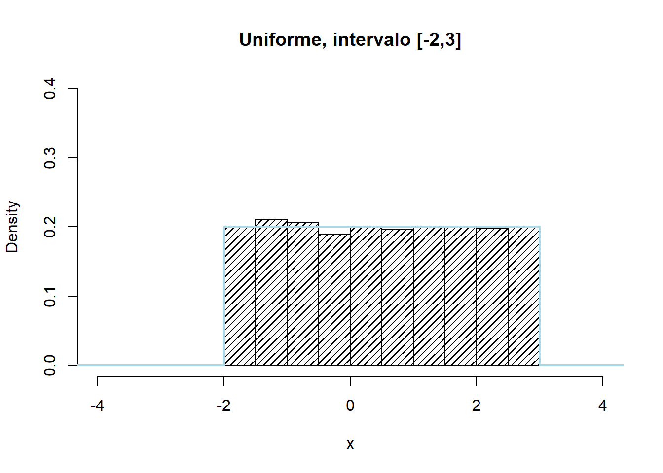 A distribuição Uniforme está relacionada com eventos que tenham a mesma probabilidade de ocorrer. Apresenta como parâmetros, \(\alpha\) e \(\beta\), ou noutras notações a e b, representando o limite inferior e o limite superior, correspondentemente, do intervalo de valores que baliza a variável aleatória (onde \(\beta>\alpha\)).
