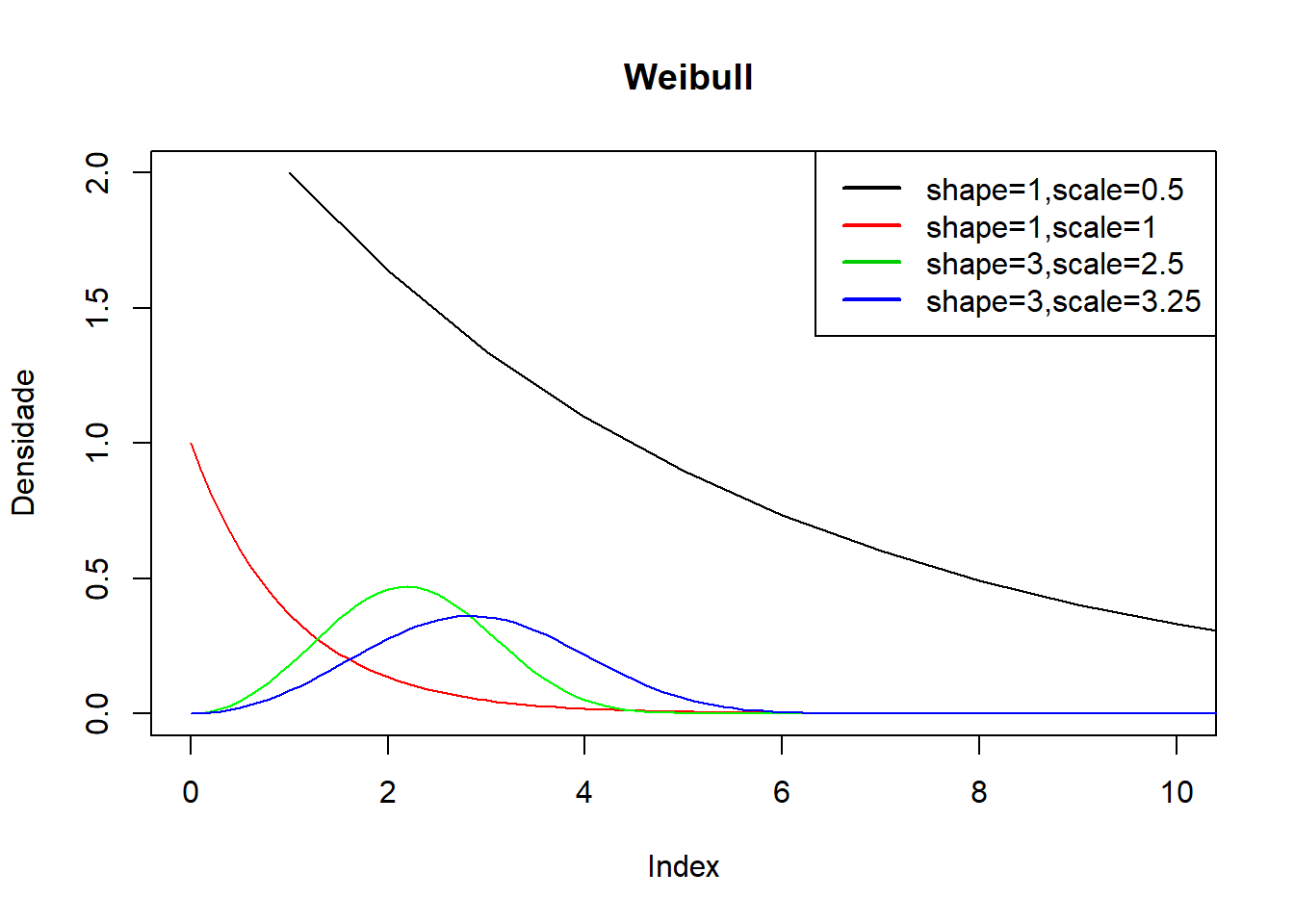 → No R, o parâmetro shape não tem valores de default e scale assume valor 1 se não for definido. Os comandos dweibull,pweibull, qweibull e rweibull funcionam de forma idêntica aos outros acima referidos.