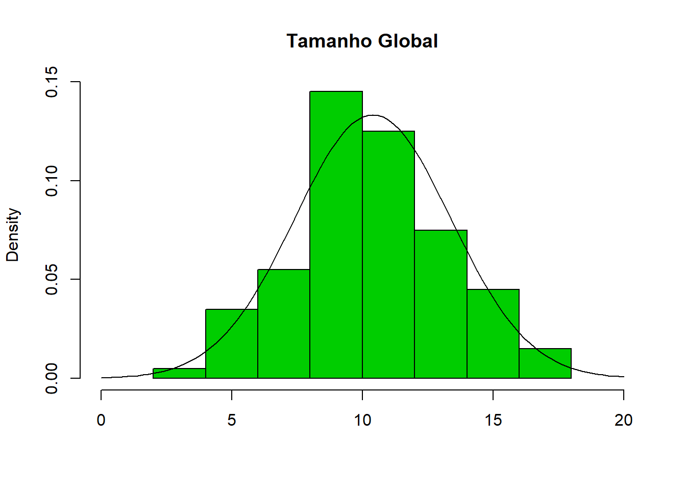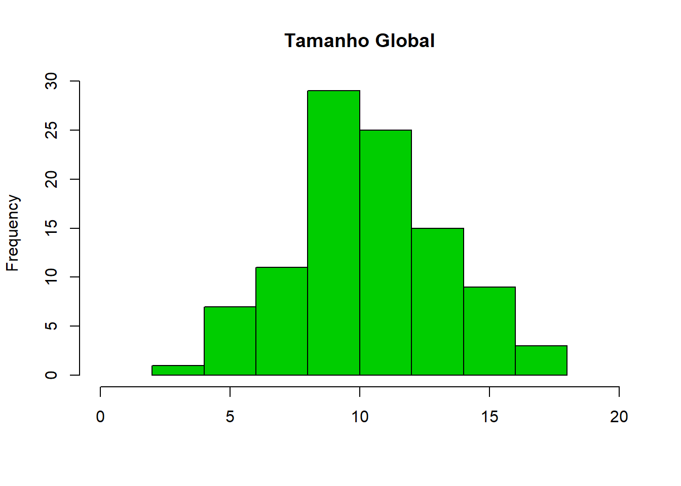 hist(data$tg,main="Tamanho Global",xlab=NULL,xlim=c(0,20),col=3,freq=FALSE)