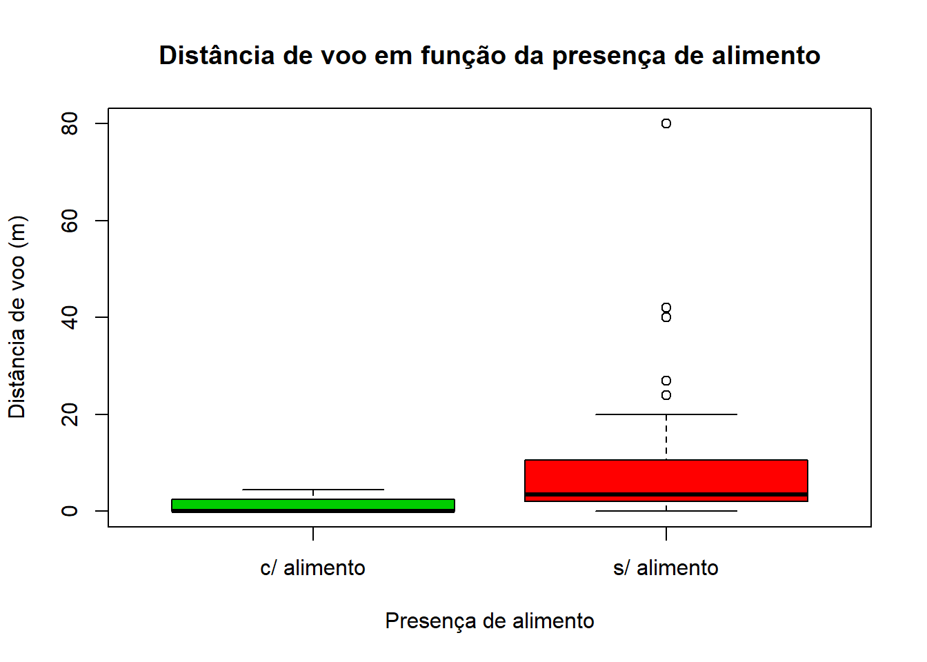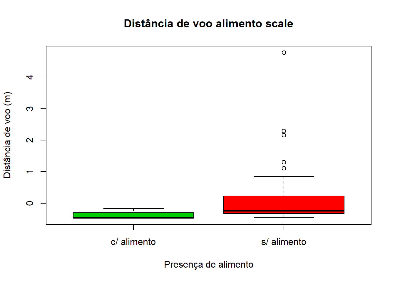 boxplot(scale1~tabela$alim, xlab = "Presença de alimento", ylab = "Distância de voo (m)", main = "Distância de voo alimento scale", col = c(3, 2))