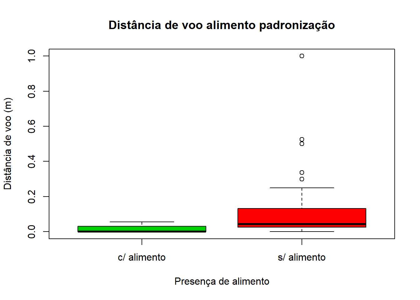 boxplot(pad~tabela$alim, xlab = "Presença de alimento", ylab = "Distância de voo (m)", main = "Distância de voo alimento padronização", col = c(3, 2))