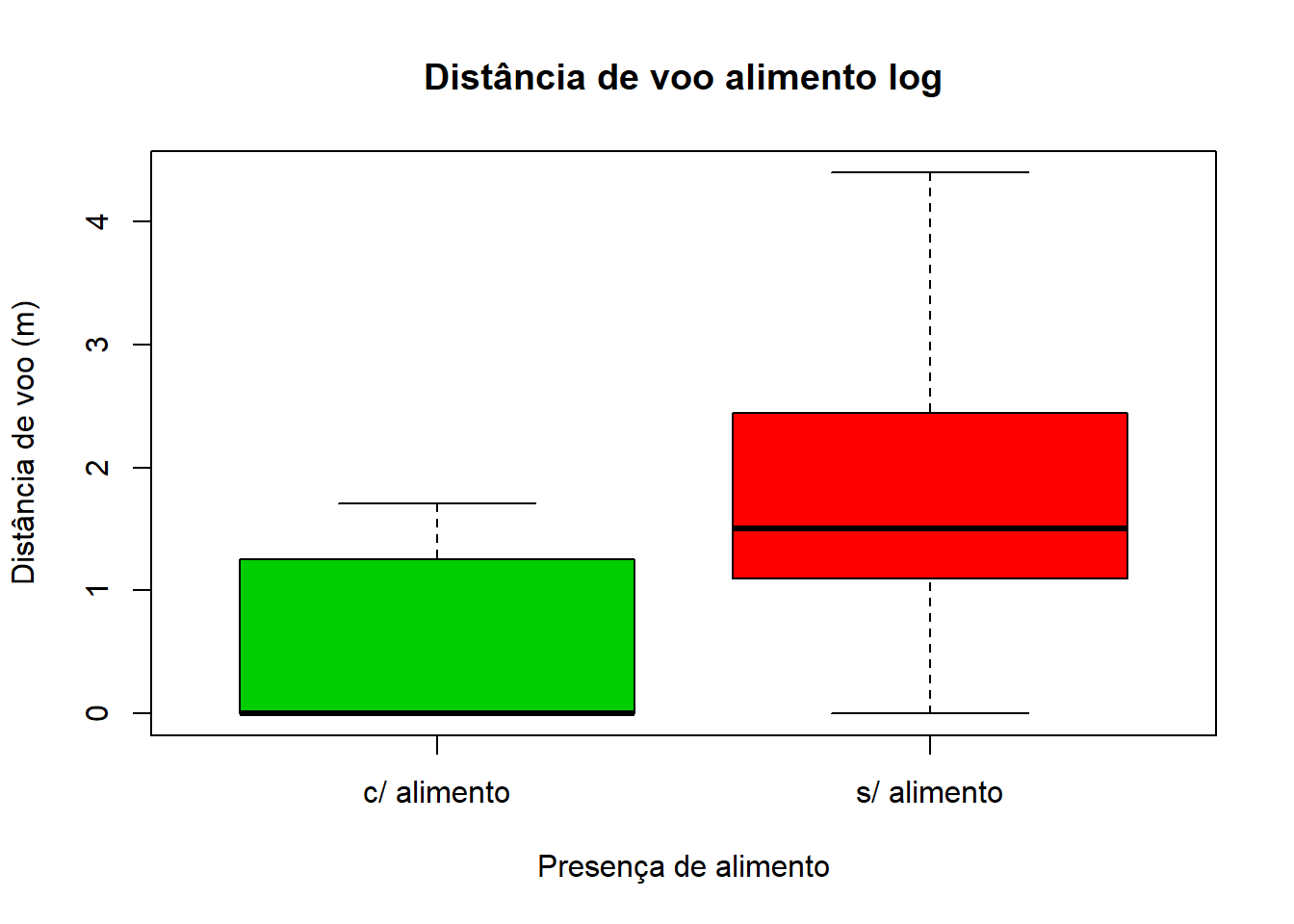 boxplot(log1~tabela$alim, xlab = "Presença de alimento", ylab = "Distância de voo (m)", main = "Distância de voo alimento log", col = c(3, 2))