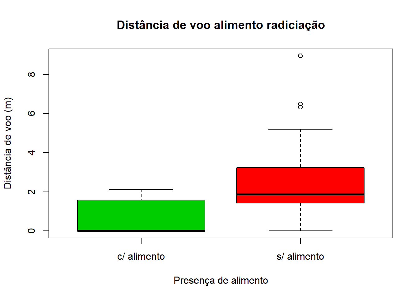 boxplot(sqrt1~tabela$alim, xlab = "Presença de alimento", ylab = "Distância de voo (m)", main = "Distância de voo alimento radiciação", col = c(3, 2))
