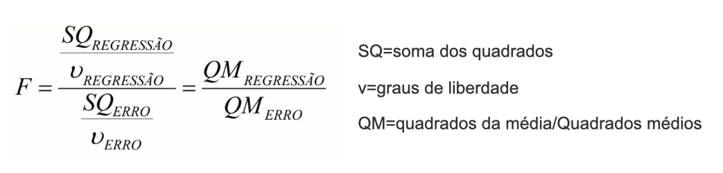 Para além de nos possibilitar fazer uma reta de regressão, o modelo linear utiliza esta mesma reta para fazer um teste de hipóteses. Neste teste, a hipótese nula é a=0, ou seja, não há relação entre x e y (reta: y=b) e para tomar a decisão de rejeição (ou não) de H0 observamos o p-value, utilizando a estatística de teste F, à semelhança da ANOVA (expressão abaixo).