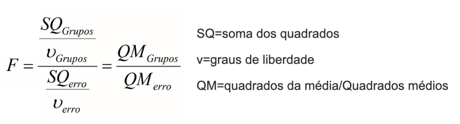 A distribuição da estatística de teste da análise de variância é a estatística de F que apresenta dois graus de liberdade diferentes (associados aos grupos e aos erros). Esta estatística baseia-se no quão estatisticamente significativas são as diferenças entre as médias dos grupos, como podemos confirmar pela expressão apresentada.
