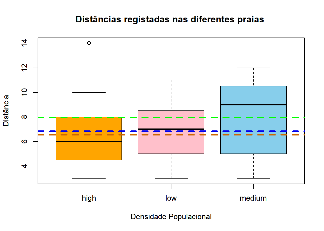 boxplot(dist~loc, col=c("orange","pink","skyblue"), ylab ="Distância" , xlab="Densidade Populacional", main= "Distâncias registadas nas diferentes praias ")
