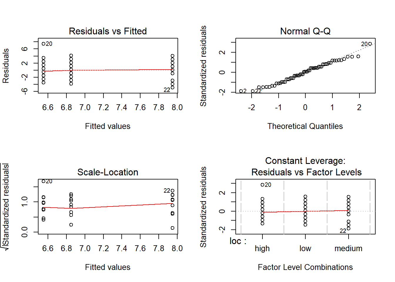 O modelo linear neste caso pega no valor basal (a menor média entre as médias dos grupos) que identifica como intercept, neste caso a média do lochigh. De seguida, subtrai à média dos outros grupos o valor do intercept, obtendo os valores das diferenças entre estas médias e o valor basal. O modelo vai, deste modo, interpretar se as variâncias entre estas médias são estatisticamente significativas, ou não. Neste caso, ao não rejeitarmos H0 concluímos que as diferenças entre médias não são significativas.