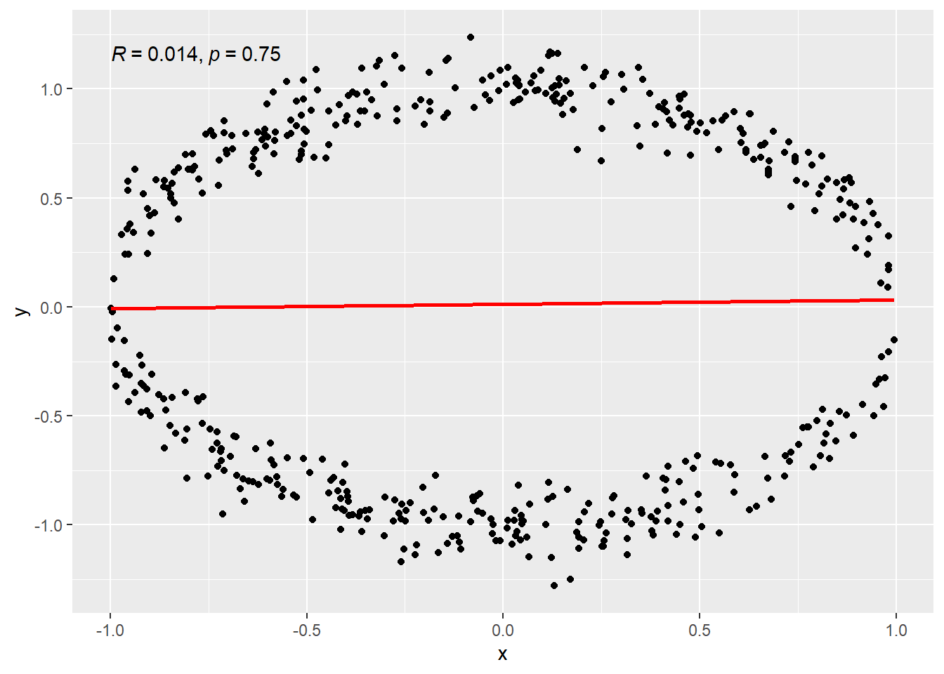 - Data falling on a circle. This is a “non-functional” relatioship. The mathematical definition of a function stipulates only one value of \(f(x)\) is the outcome for a value of \(x\). On a circle, two values are possible for an input value of \(x\), except the leftmost and rightmost points of the circle. (Remember that horizontal line rule?)