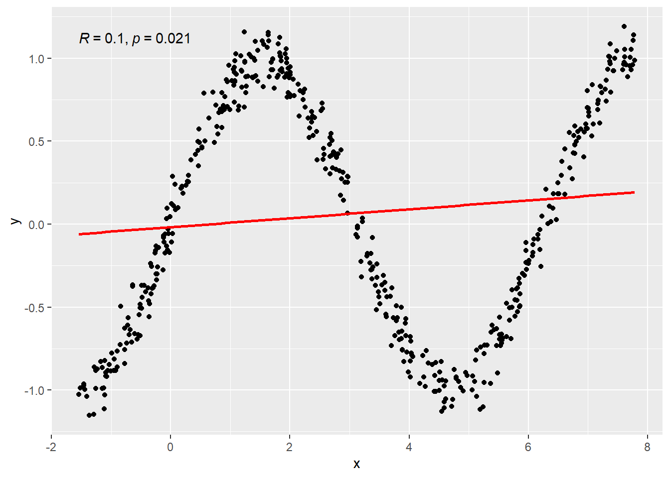 Second plot shows an oscilating/non-linear relationship so \(r\) is a bad measure of the relationship especially because this is a pattern where the ups and downs cancel eachother out. \(r = -0.2592476\) which implies no reliable linear relation. However, hopefully it is quite clear that a viable relation between \(x\) and \(y\) exist.
