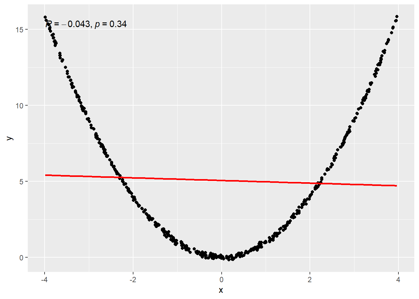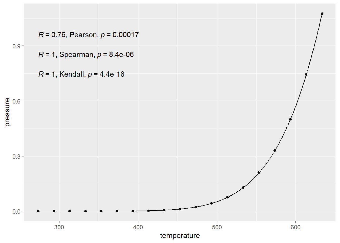 This \(r\) value only measures how well the data follow a LINE. So if there isn’t a linear relationship, \(r\) won’t capture all the information about the relationship. The value for \(r\) in the pressure data is given in the top right corner of the graph here. Notice that it is a capital R. This is because of “notation forking” in math, i.e., someone using a different symbol for the same thing. This wouldn’t be so bad except for the fact that academics who make this kind of shit are egotistical shits and think their idea is better. Which was first, \(r\), or \(R\)? I don’t know. I use \(r\), whatever.